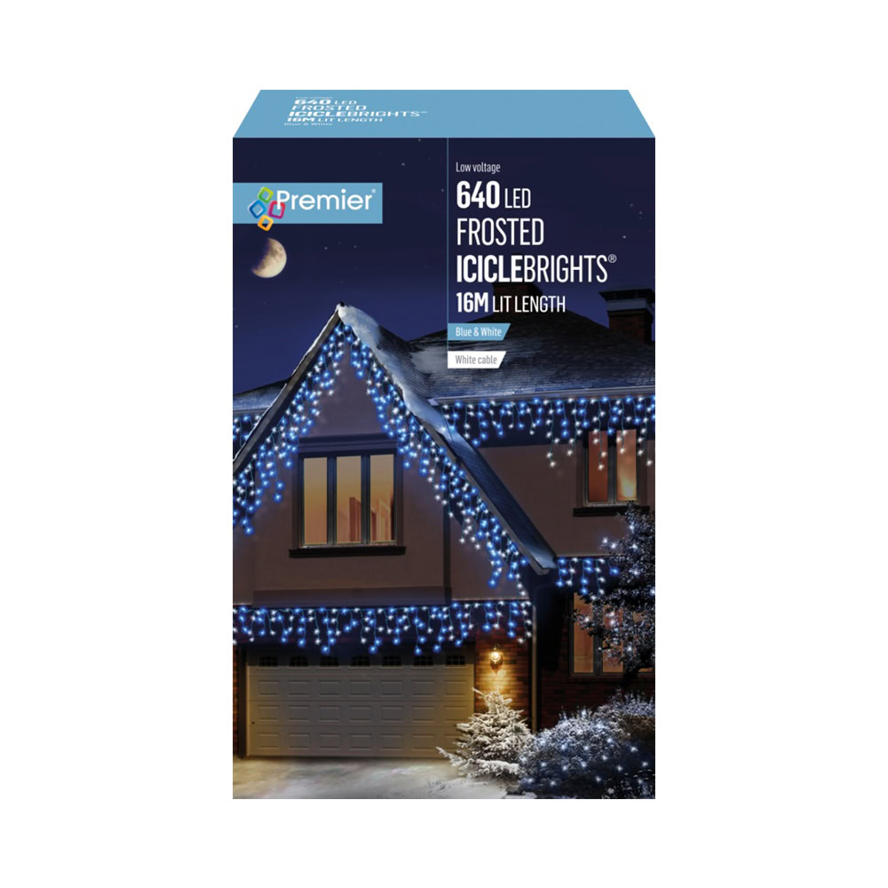 The Premier Multi Action 640 LED Frosted Cap Icicles Blue/White are designed to transform your home into a sparkling winter wonderland. Featuring 640 energy-efficient LEDs encased in frosted caps, these lights combine alternating blue and white tones to create a stunning icy effect that stands out day or night.